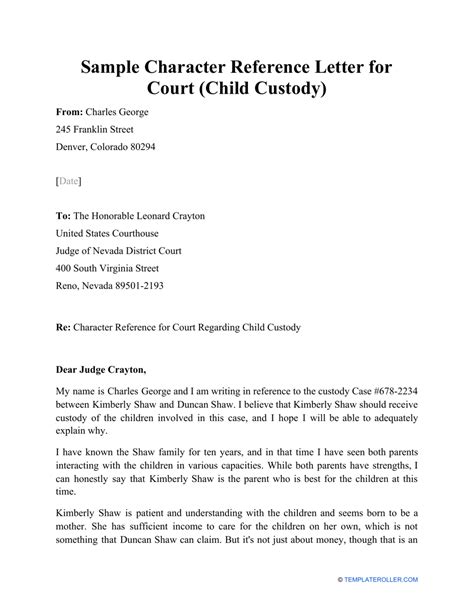 Sample Child Custody Character Reference Letter - Fill it online and download or print as needed. Create a free character reference letter for court (child custody) in pdf and word formats. How to write a character reference letter for child custody. Providing specific examples of a parent’s fitness in a written character reference letter can make a real difference in the outcome of a child custody case..